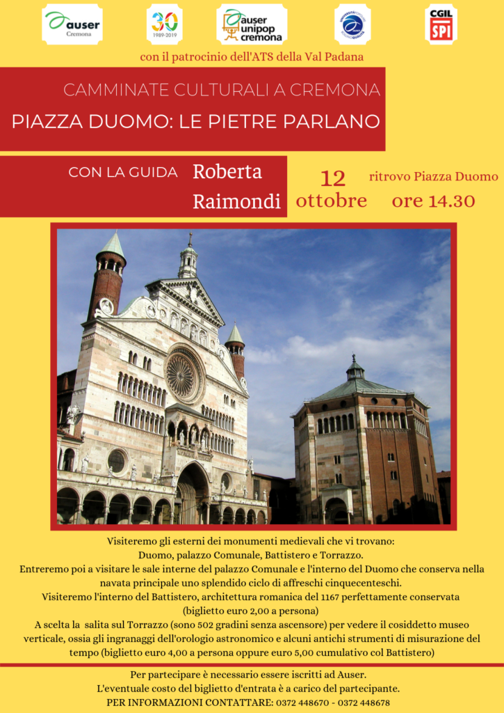siete tutti invitati a partecipare alla prima delle Camminate culturali a Cremona, in programma per sabato 12 ottobre 2019 . Ci ritroveremo alle ore 14.30 in piazza Duomo, insieme alla guida Roberta Raimondi e andremo alla scoperta del Duomo, del Torrazzo, del Battistero e del Palazzo Comunale.